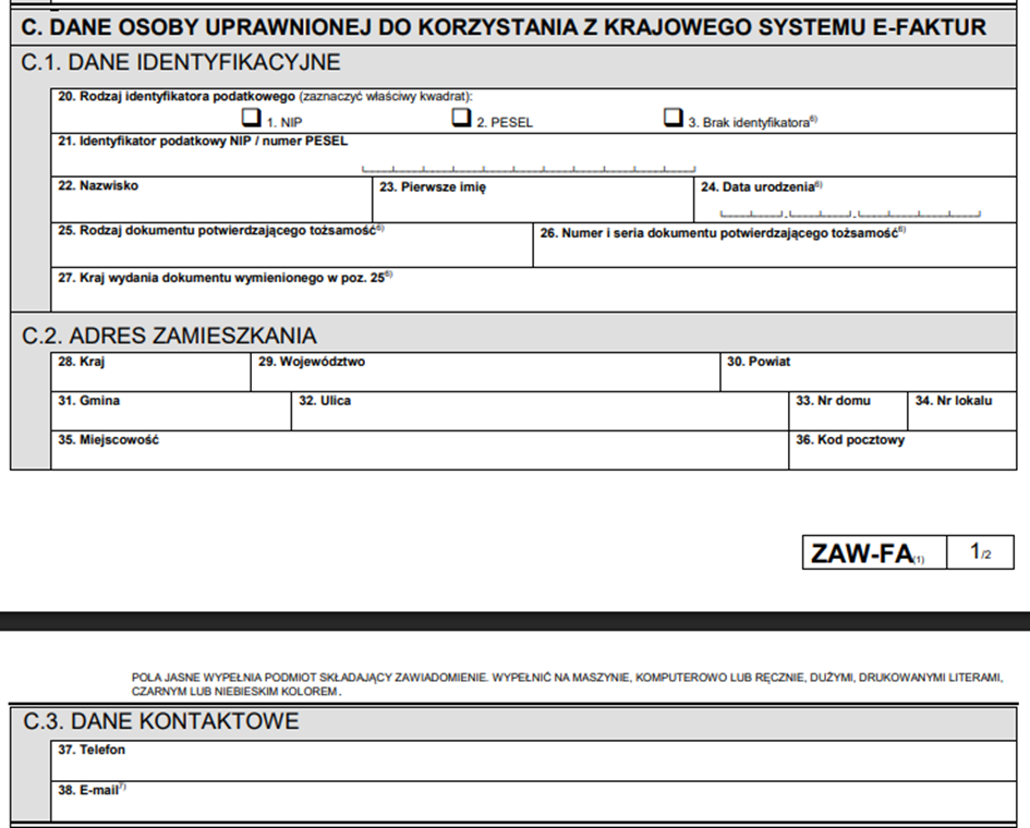 Część „C” to wskazanie osoby fizycznej uprawnionej do korzystania z KSeF. Należy wypełnić wszystkie pola. Bardzo ważne jest pole 38 – adres e-mail, ponieważ na ten adres osoba wskazana otrzyma informację o nadaniu uprawnień: