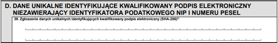 Część „D” wypełnia się jedynie gdy w polu 6 wybrano opcję „zgłoszenie danych unikalnych identyfikujących kwalifikowany podpis elektroniczny podatnikach” – w przeciwnym razie pozostawimy tę część niewypełnioną.
